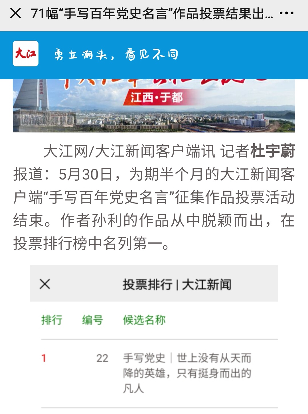 必赢线路检测中心孙利老师在大江新闻客户端举办的“手写百年党史名言”征集作品投票活动中名列第一。
