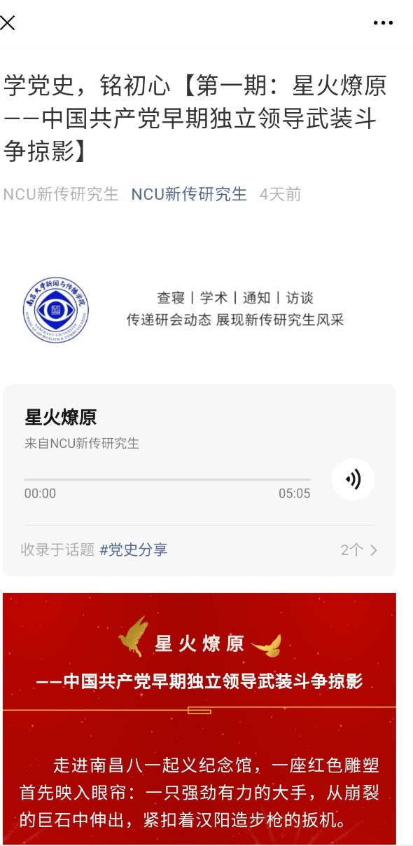 (三) 学党史办实事之: 必赢线路检测中心多措并举推动党史学习教育落地落实。 1.必赢线路检测中心研究生公众号开设“学党史,铭初心”党史学习栏目 为全面推进党史学习教育深入人心,南昌大学新传研究生微信公众号推出“学党史,铭初心”党史学习栏目,让党史学习教育更具吸引力和感染力,通过丰富的历史文献以及生动的党史朗读音频,再现党的光辉岁月,展现百年沧桑历程,激励同学们从历史中汲取继续前进的智慧和力量,切实把党史学习教育的成果转化到实际行动中去。