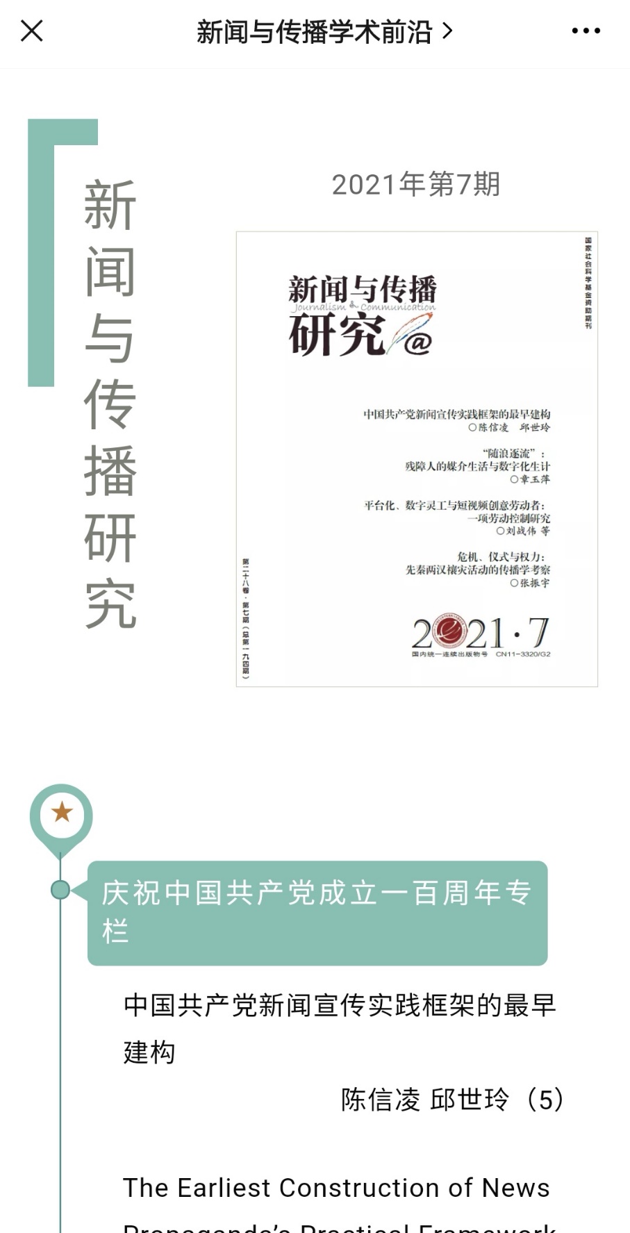 (二) 学党史办实事之: 新闻传播学院院长陈信凌在《新闻与传播研究》刊物上发表《中国共产党新闻宣传实践框架的最早建构 》一文。