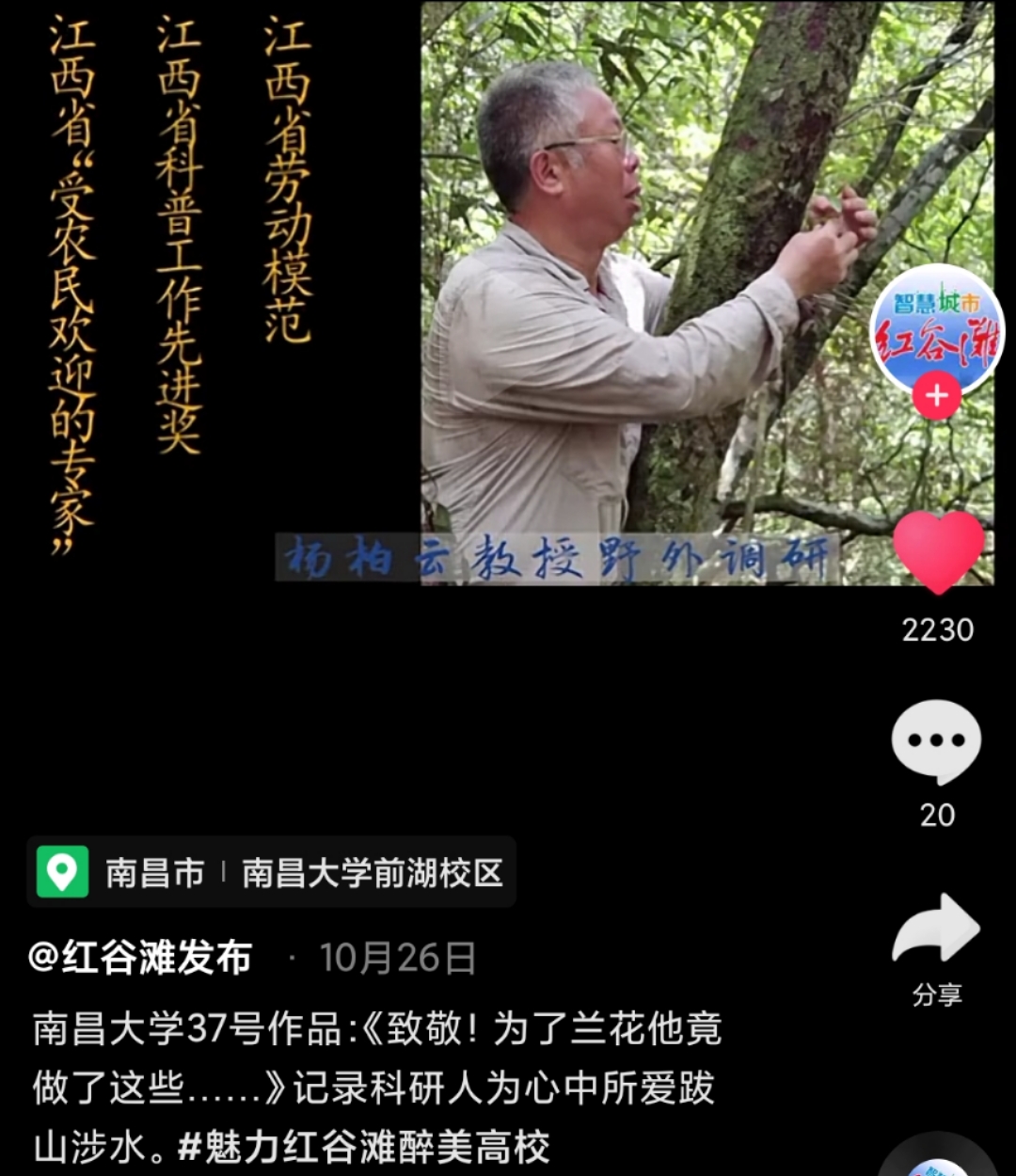 学党史办实事之: 新闻与传播学院组织学生参与“美丽红谷滩·最美高校”抖音短视频征集大赛 为庆祝中华人民共和国成立72周年,助力红谷滩区文化强区建设,彰显红谷滩区辖区高校特色校园文化,记录多姿多彩的校园生活,展现广大师生饱满的精神面貌,红谷滩区委宣传部、红谷滩区辖区七所高校党委宣传部于10月组织开展了“魅力红谷滩·最美高校”抖音短视频征集大赛。 必赢线路检测中心积极动员广大师生参与本次短视频大赛,用镜头记录校园生活,体味校园文化。在丰富课外生活之余,加强了学生对学校的认同感与归属感。其中,刘琳老师以“立德树人标兵、‘互联网+’大赛花絮和志愿者风采、优秀学生风貌”三个板块为主,指导87名学生创作出16个“闻樟园”系列作品,这些作品在“魅力红谷滩·最美高校”抖音短视频征集大赛中获得了广大用户的喜爱与支持,点击率高达5078次,展现了南昌大学师生朝气蓬勃、青春昂扬的精神风貌。 在“立德树人标兵”板块中,作品《致敬!为了兰花他竟做了这些……》点击率达2241次。该作品以兰花为切入点,记录了南昌大学杨柏云教授为了心中所爱的植物学跋山涉水进行调研的日常生活,于细微处见证了科研人员的辛勤与伟大。同时杨教授为科研而披荆斩棘的精神感染了许多学子,大家纷纷在评论中表示要向杨教授学习。正如古人所说,“生无桃李春风面,名在山林处士家”,如同杨教授这般默默无闻的南大科研人还有很多,他们的工作态度与科研精神值得赞扬与学习。