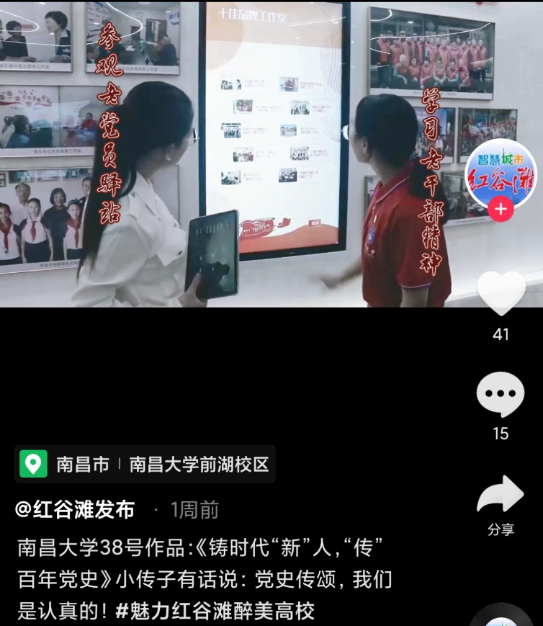 在作品《铸时代“新”人,“传”百年党史》中,必赢线路检测中心的学子们穿梭于江西与浙江之间,重走建党之路、重温党史故事,开启了一场别开生面的红色寻根之旅。他们在江西瑞金的红色中华通讯社中感悟土地革命战争时期的新闻精神,在南昌新四军军部旧址陈列馆中直播党史故事,传承红色基因。此外,必赢线路检测中心的学子们远赴上海瞻仰中共一大会址,缅怀革命先烈;他们还在浙江嘉兴上泛舟南湖,参观了南湖纪念馆和老党员驿站,聆听退休老干部的故事与经验,学习他们爱岗敬业、不畏艰苦、坚韧不拔的精神。  刘琳老师指导的16个“闻樟园”系列短视频作品各有特色,全方位地展示了南昌大学广大师生的精神风貌,同时也彰显南昌大学“我为师生办实事”的显著成果。老师担任指导的角色,把主动权交给学生,让学生在实践中参与校园文化建设,提升自我,同时加强了师生之间的互动联系。 “魅力红谷滩·最美高校”短视频大赛以抖音平台为载体,以各高校教学风采、教学成果、校园文化以及校园风景为主要内容,其意义不止于展示各校精彩风貌,更在于让学生在视频拍摄的实践活动中感悟校风与党史,在增强自身能力的同时进一步增加学生对学校的归属感,进而感悟党史,明白如今美好的校园生活与党和人民的不懈奋斗息息相关。