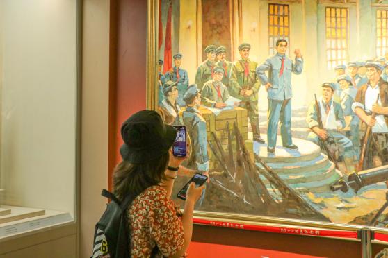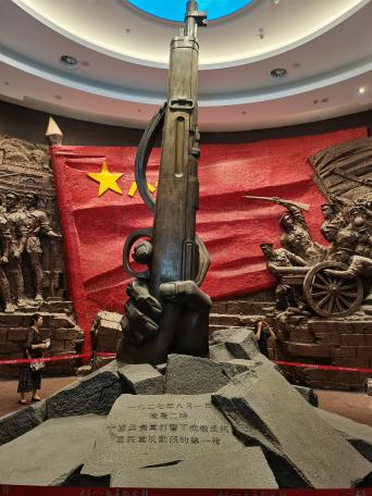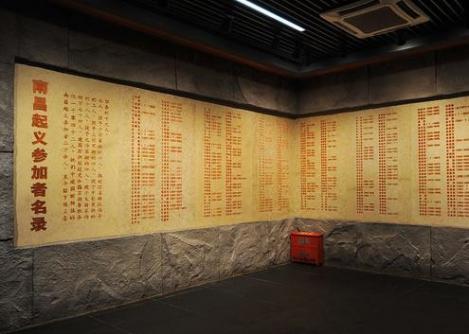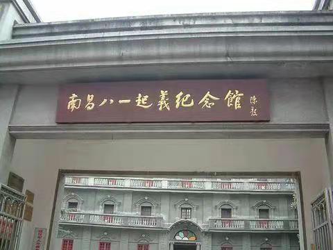 (两处场馆参观的同学在直播间内积极互动) 南昌八一起义纪念馆是为纪念南昌起义而设立的专题纪念馆,成立于1956年,整个纪念馆共两层,占地面积5903平方米,馆内陈列内容包括新馆大楼南昌起义、人民军队光辉历程以及旧址复原陈列,馆内陈列着多组图片、图表、文物展品、艺术品。   图1:南昌八一起义纪念馆大门 踏入纪念馆大门,映入眼帘的是由陈允贤于一九九七年创作的一组人物雕像《一代英豪》,刻画着南昌起义五位领导人:周恩来、贺龙、叶挺、朱德、刘伯承的勇敢与自信。进入大楼,只见一只巨手举着一把枪,这象征着打响南昌起义的第一枪。     图2:雕像《一代英豪》 图3:第一枪 同学们沿着馆内的指示方向依次参观,看见了威力巨大的大炮、火力十足的机关枪,也看见了牺牲在炮火中的革命烈士的名单、看见了为起义作出贡献的英雄的塑像,这些都让我们深刻了解到南昌起义的那段历史。     图4:大炮 图5:南昌起义参加者名单 继续往前走,就是一楼通往二楼的阶梯,它不似传统意义上的阶梯,阶梯是石头的,旁边长满了花草,四周的墙壁上画着井冈山的风景,每走一步都感觉置身于美丽的井冈山上。到了二楼,我们会看见大屏投影,字幕、动画、同期声的叠加,全方位向我们展示了南昌起义的全过程,同学们纷纷表示“心灵受到了震撼”。不管是在馆内还是在馆外,纪念品随处可见,军服展示以及军服的试穿都让我们对南昌起义有了更深刻的认识,同学们也纷纷表示“很有纪念意义,钱花得值”。