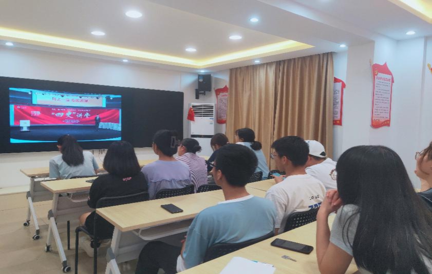 图:学生认真学习收看“四史讲堂” 在学院分党校,学院领导、学科带头人,给学生上党课,宣讲党史,传播红色基因,使入党积极分子接受心灵的洗礼,更坚定了理想信念,更增强了纪律意识。同学们对中国共产党的认识更加深入,入党积极性显著提高,过去想要入党的同学以学生干部为主,现在普通同学也都积极要求入党,写入党申请书的人数比往年多了一倍,通过率较以往提高了50%。通过学习,他们热情高涨,积极参加各项活动,学校百年校庆、第七届国际“互联网+”大赛、人民网的“启程吧、人民红”、“红色文物青年说”等各项大型活动都活跃着学院师生的身影。