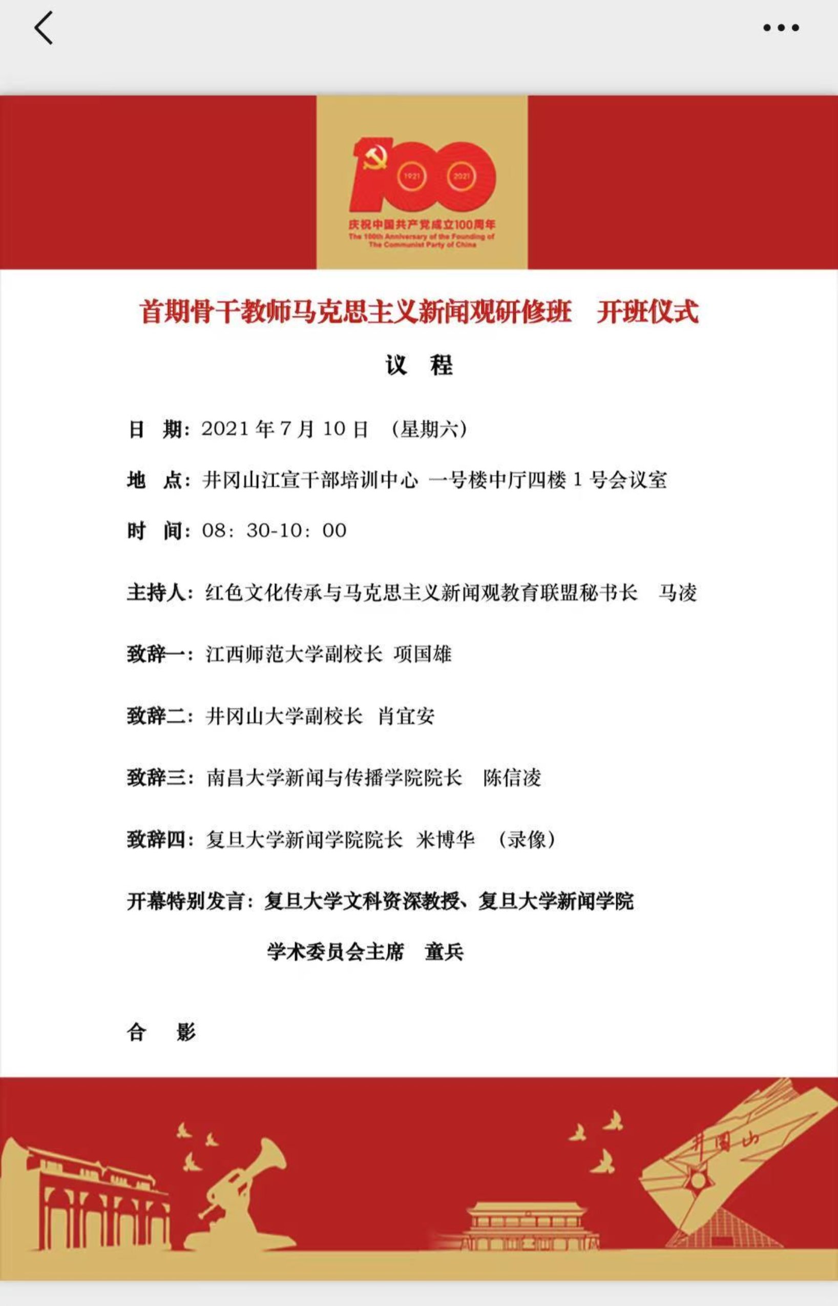 2021年7月10日上午,必赢线路检测中心院长陈信凌参加在井冈山江宣干部培训中心一号楼中厅四楼1号会议室举办的首期骨干教师马克思主义新闻观研修班开班仪式,并发表致辞。