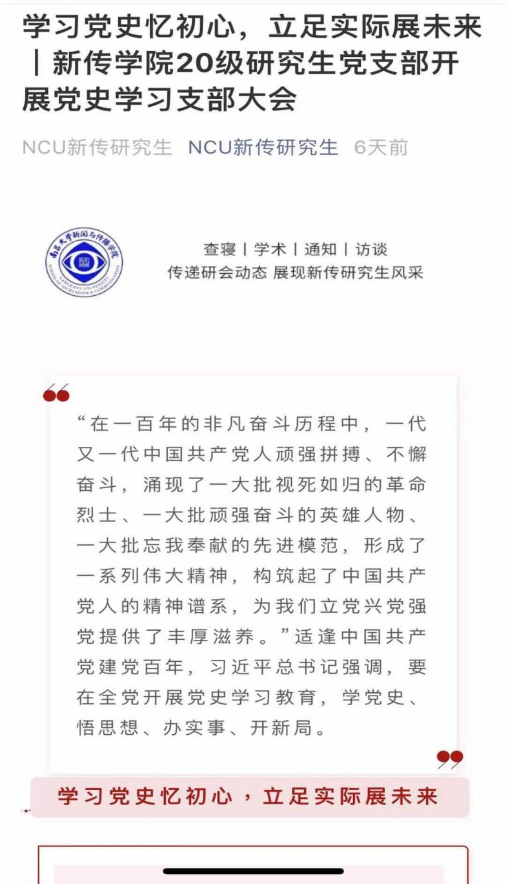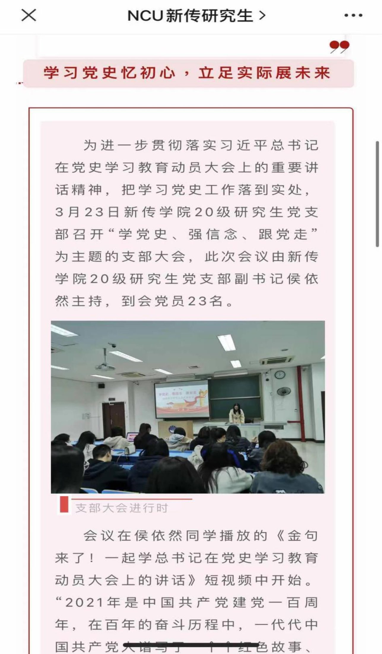 (二) 学党史讲党课 2021年4月2日下午,2019级播音与主持艺术专业团支部书记代玉同学作为青年团员代表,在“南昌大学'信仰之路'百年党史百名书记百堂微课活动暨'赣鄱学子心向党'活动”启动仪式”上进行了题为《脱贫攻坚全胜年,百年薪火传承时》的微课展示。